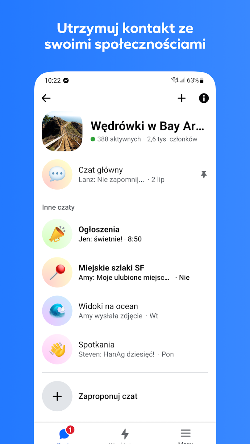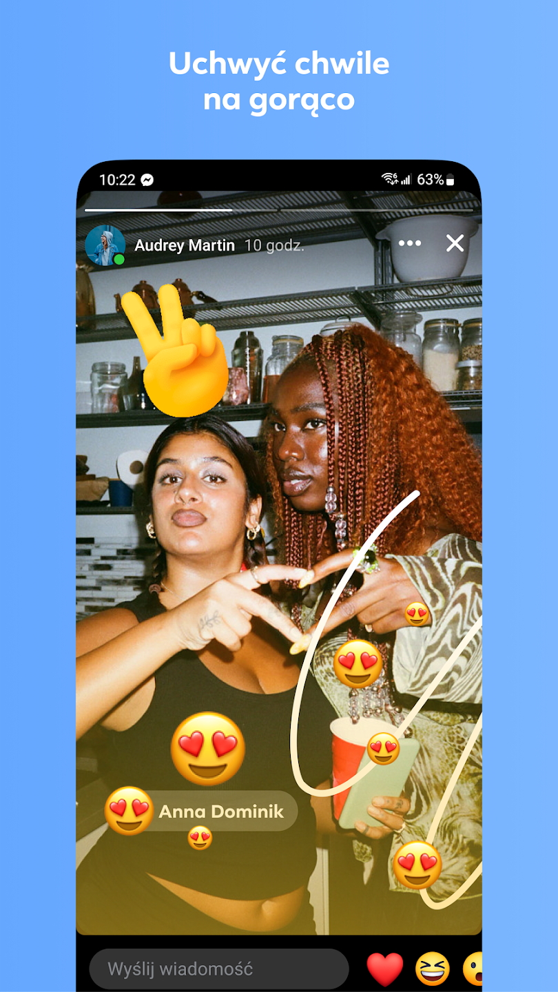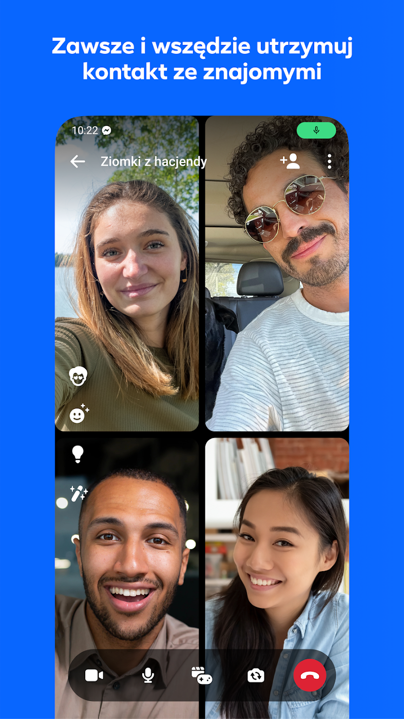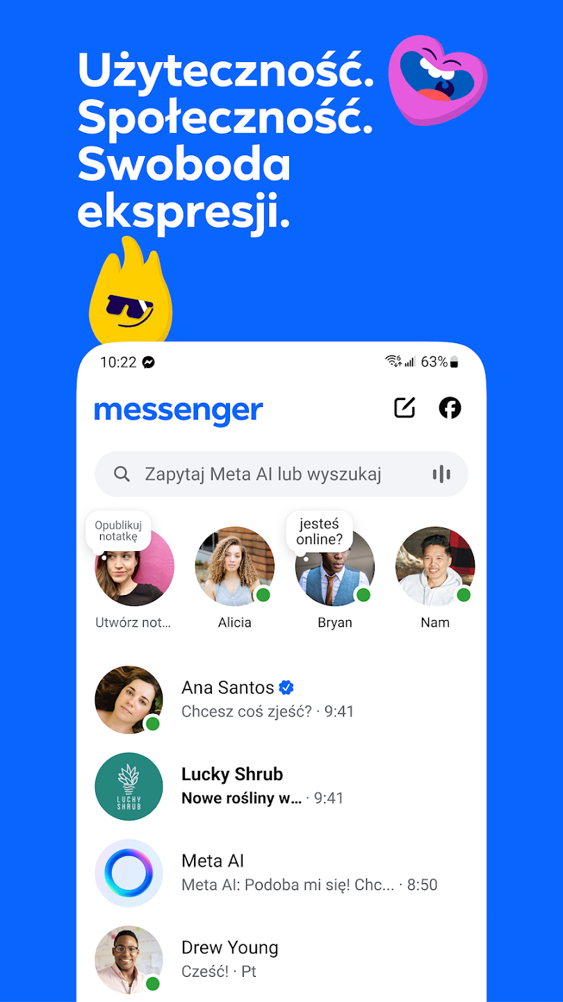 Messenger to bezpłatna aplikacja do przesyłania wiadomości, która pozwala Ci rozmawiać z każdym, gdziekolwiek jesteś. Łącz się z bliskimi, odkrywaj wspólne zainteresowania, twórz własne społeczności i wyrażaj emocje nie tylko słowami – wszystko w jednej aplikacji.