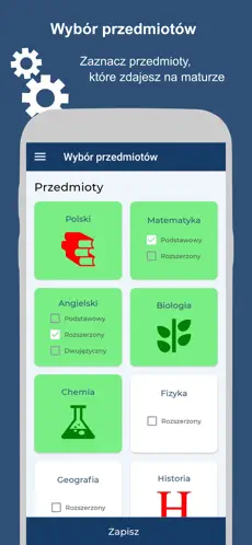 W aplikacji znajdziesz testy z języka polskiego, matematyki, języków obcych, biologii, chemii, historii i innych przedmiotów obowiązkowych oraz dodatkowych.