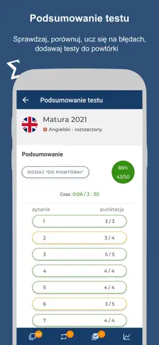 Aplikacja analizuje Twoje odpowiedzi, pokazuje mocne strony i wskazuje obszary, które wymagają poprawy.