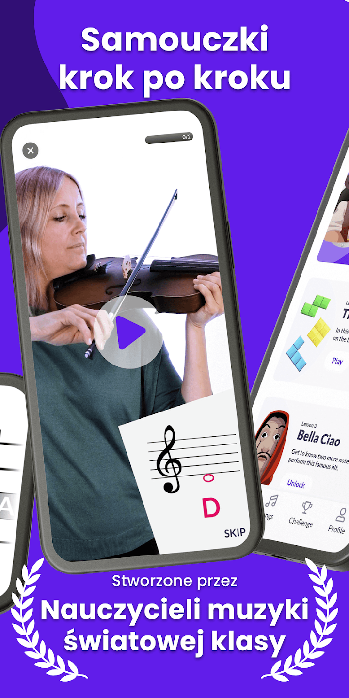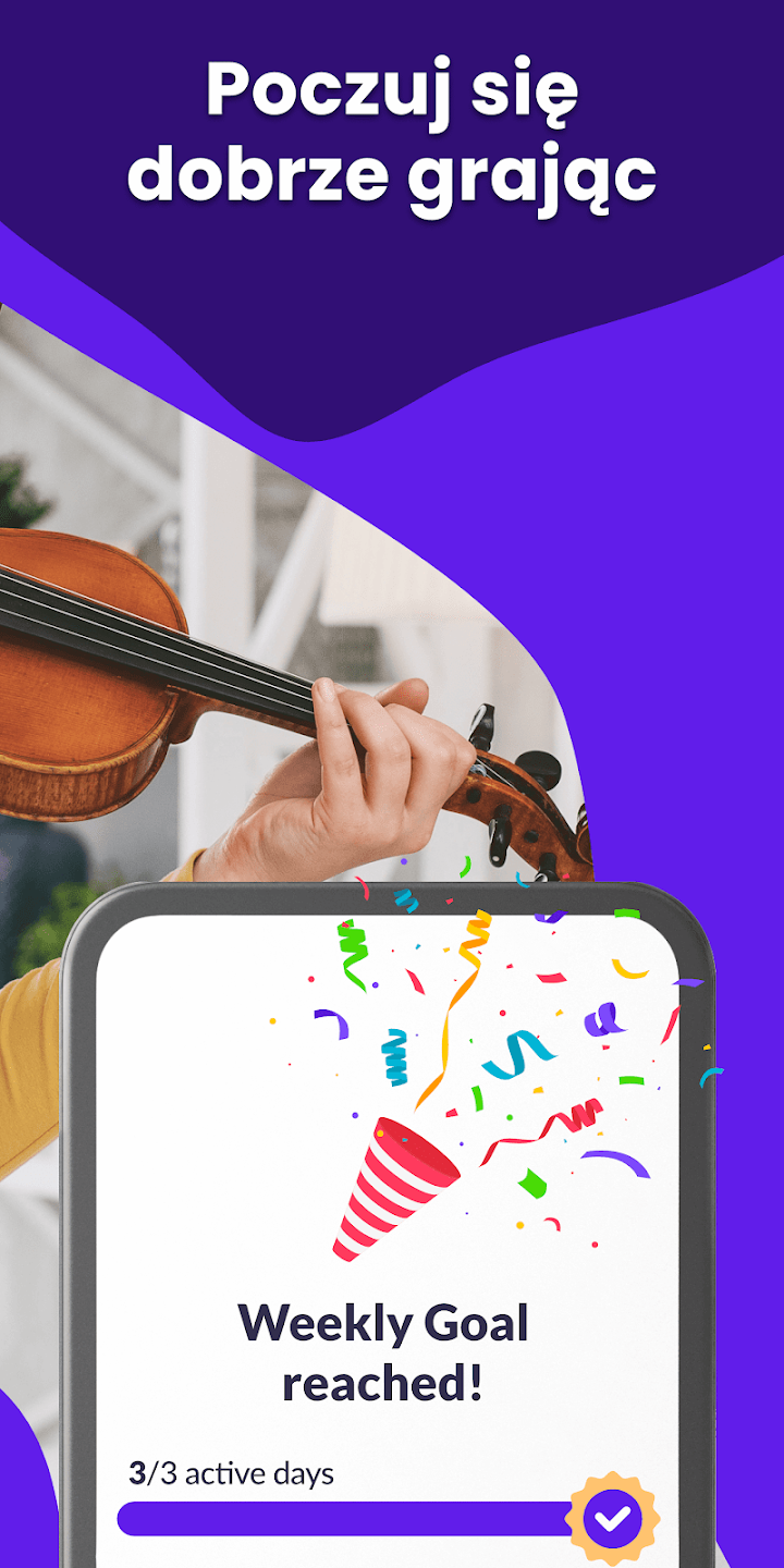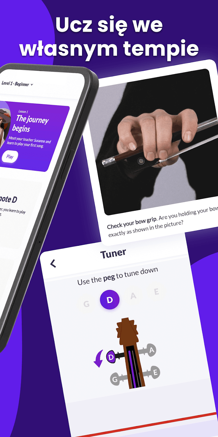 Aplikacja oferuje uporządkowane lekcje gry na skrzypcach – od podstawowych technik trzymania instrumentu po bardziej zaawansowane ćwiczenia muzyczne.