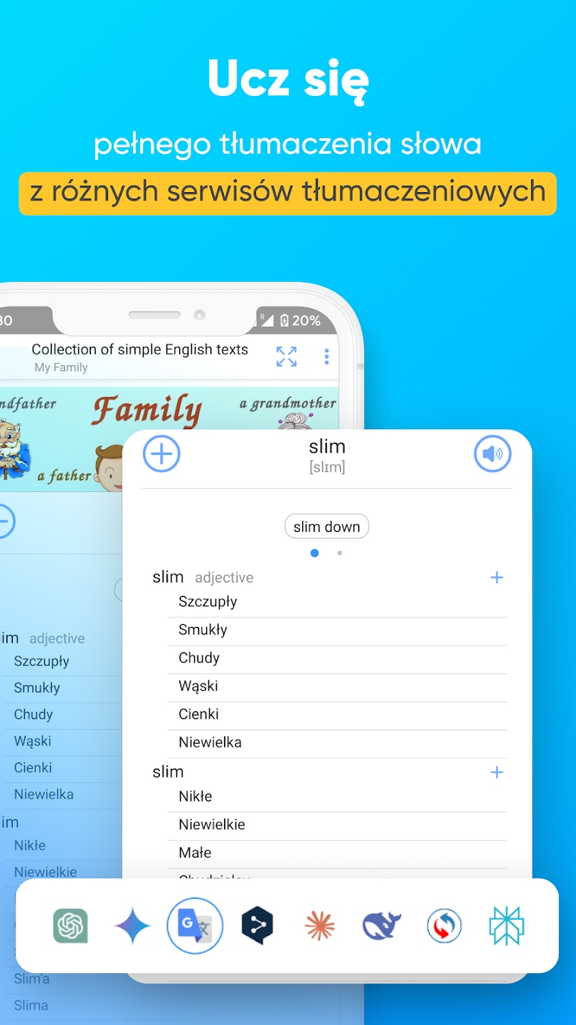 Klikając na wybrane słowo, możesz natychmiast zobaczyć jego tłumaczenie i znaczenie.