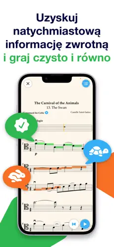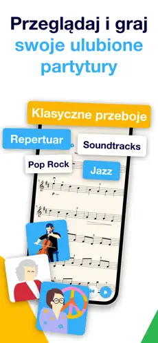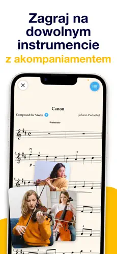 Aplikacja oferuje szeroki wybór utworów dla wielu instrumentów – od skrzypiec i fortepianu po saksofon, wiolonczelę czy flet. Znajdziesz tu utwory klasyczne, współczesne i edukacyjne, dostosowane do różnych poziomów zaawansowania.