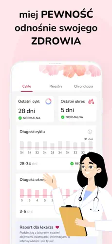 Aplikacja umożliwia zapisywanie dat rozpoczęcia i zakończenia okresu oraz automatycznie oblicza długość cyklu.