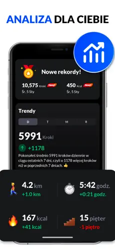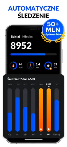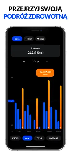 Aplikacja prezentuje dane w przejrzystych wykresach dziennych, tygodniowych i miesięcznych. Dzięki temu możesz łatwo analizować swoje wyniki i obserwować poprawę kondycji.