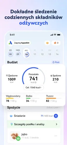 Appediet umożliwia monitorowanie dziennego spożycia kalorii oraz makroskładników, takich jak białko, tłuszcze i węglowodany.