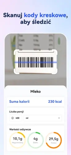 Aplikacja pozwala na analizę jedzenia na podstawie zdjęcia lub opisu, automatycznie obliczając kalorie i wartości odżywcze.
