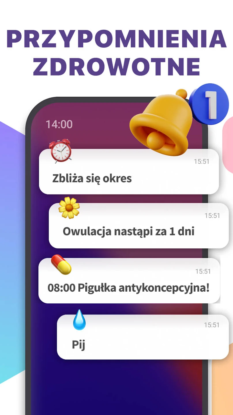 Funkcja powiadomień pomaga pamiętać o zbliżającym się okresie lub ważnych dniach cyklu.