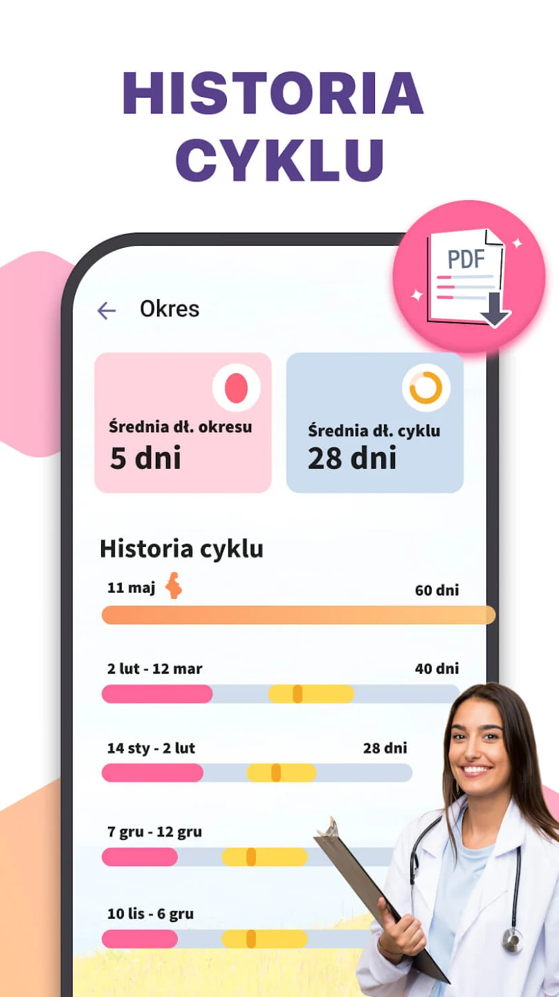 Aplikacja umożliwia dokładne śledzenie dat miesiączki oraz długości cyklu, prezentując dane w przejrzystej formie kalendarza.
