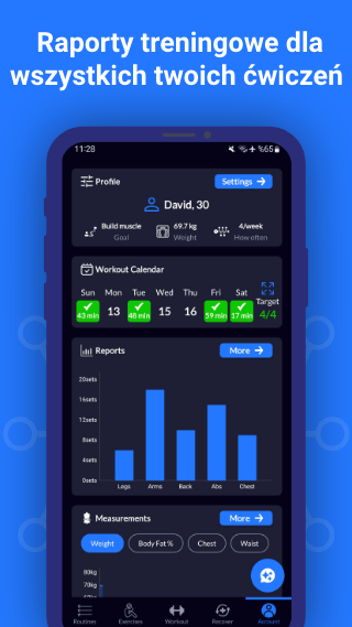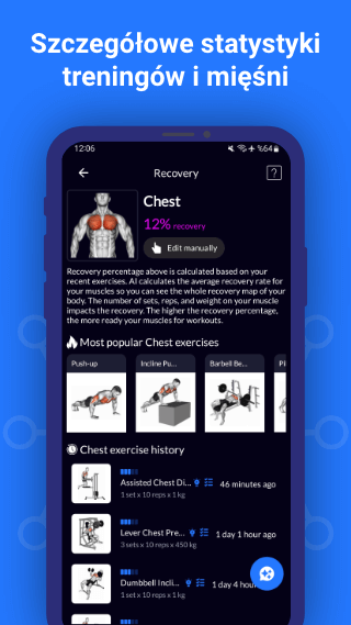 Aplikacja zapisuje historię treningów, pozwalając śledzić rozwój siły, wytrzymałości oraz regularność ćwiczeń. To doskonałe narzędzie do analizy efektów i utrzymania motywacji.