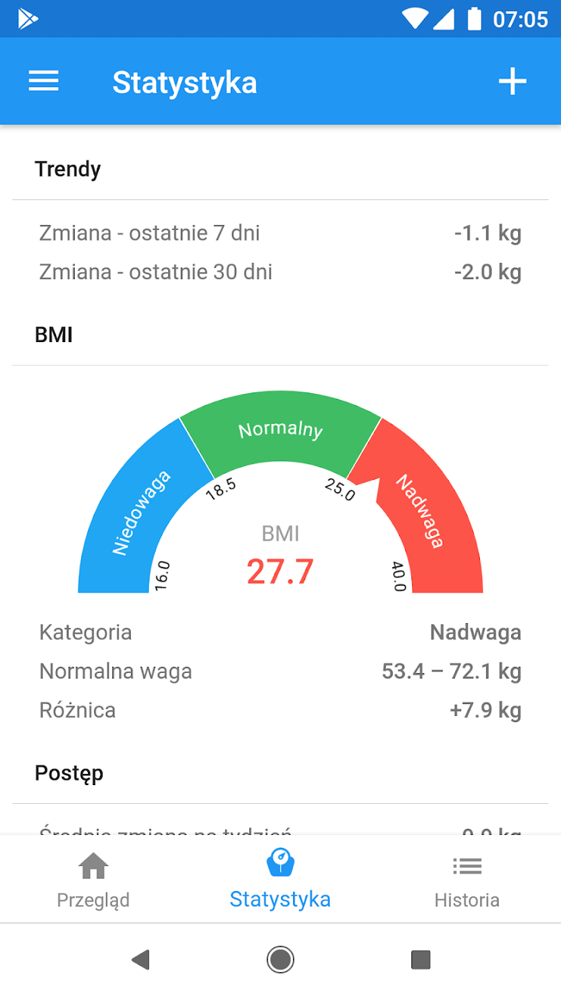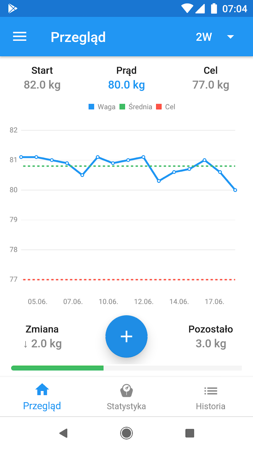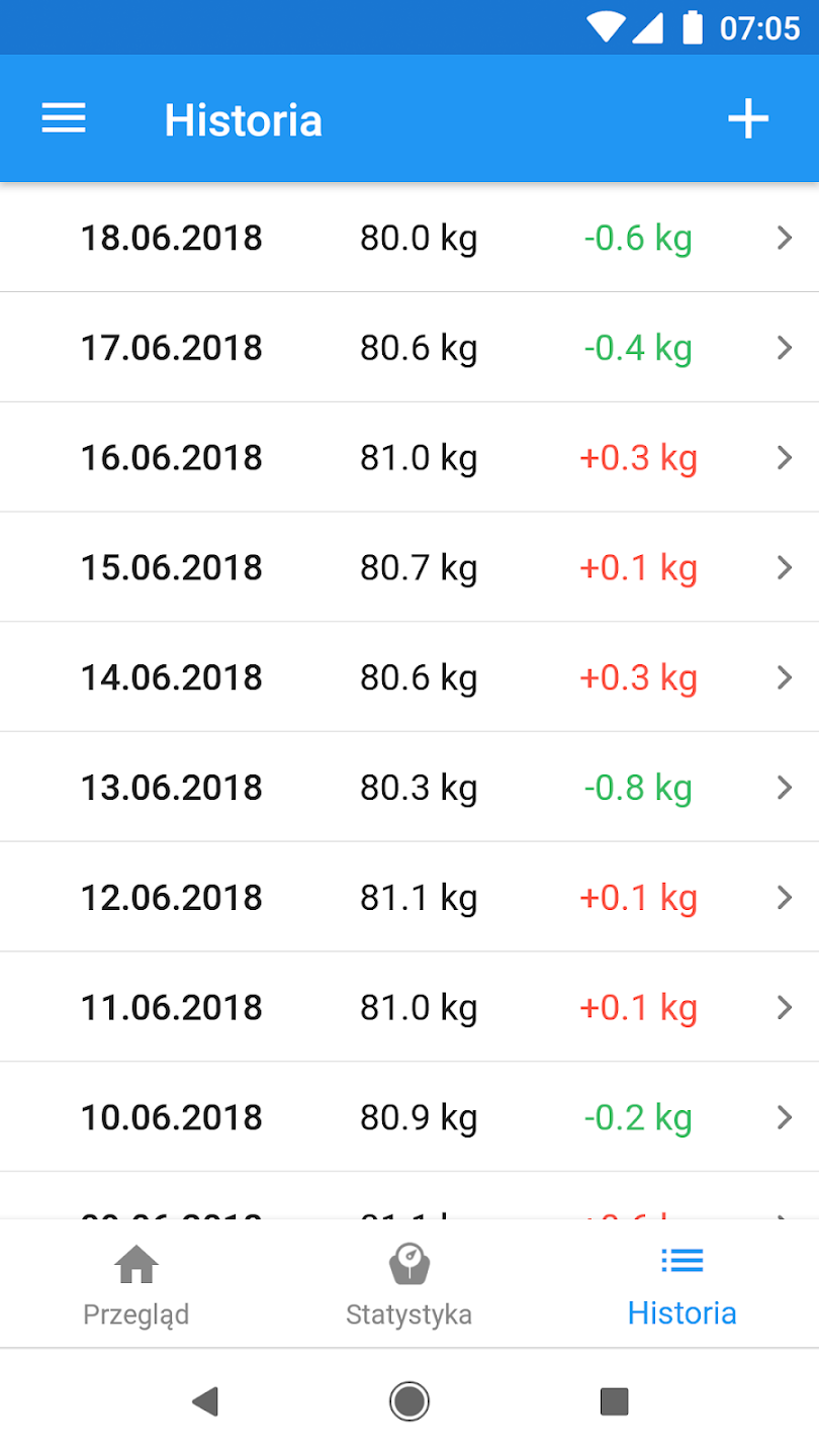 Aplikacja umożliwia szybkie i wygodne dodawanie dziennych pomiarów wagi, co pozwala na bieżąco śledzić zmiany i reagować na nie w odpowiednim czasie.