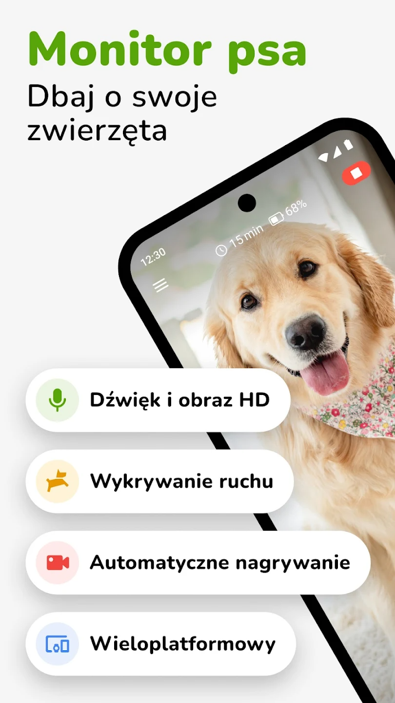 Podgląd na żywo – obserwuj swojego psa w czasie rzeczywistym za pomocą telefonu, tabletu czy komputera.
