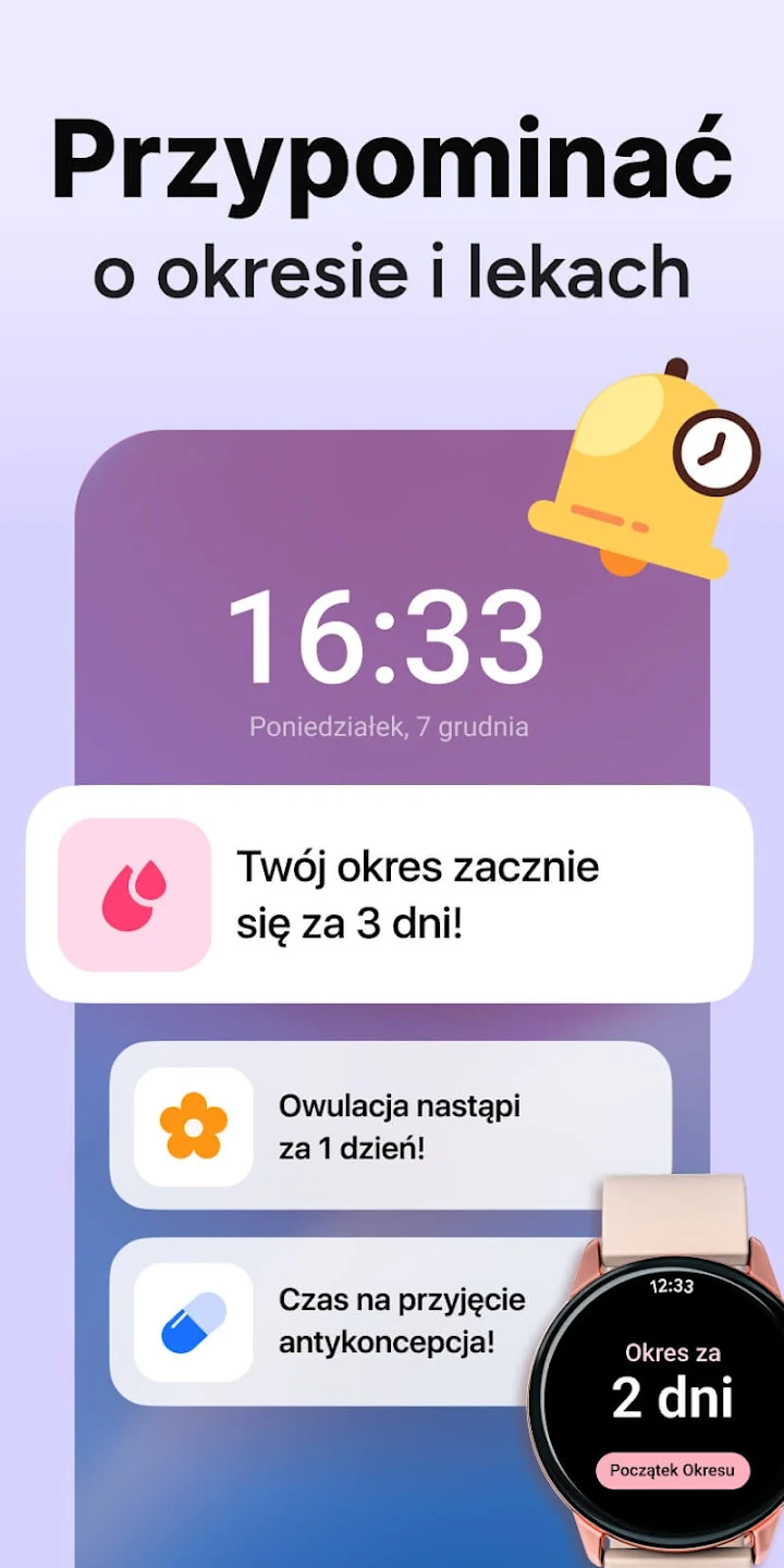 Aplikacja wysyła powiadomienia przypominające o zbliżającej się miesiączce, owulacji, a także o przyjmowaniu leków lub suplementów. Pomaga to lepiej planować dzień i unikać niespodzianek.