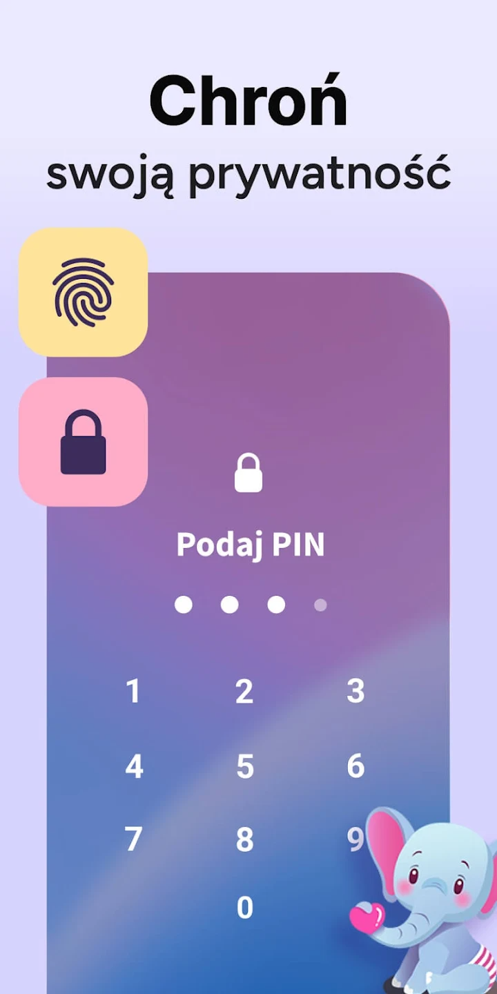 Aplikacja zapewnia możliwość ustawienia hasła lub blokady biometrycznej, dzięki czemu dane użytkowniczki są w pełni bezpieczne.