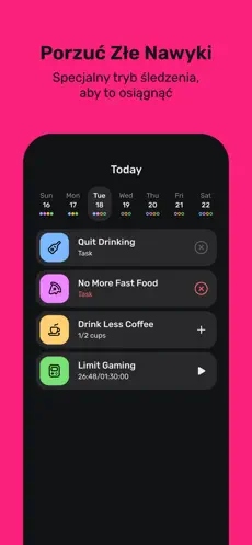 Aplikacja pozwala na łatwe dodawanie nowych nawyków – od picia większej ilości wody po regularne ćwiczenia czy naukę języków obcych.