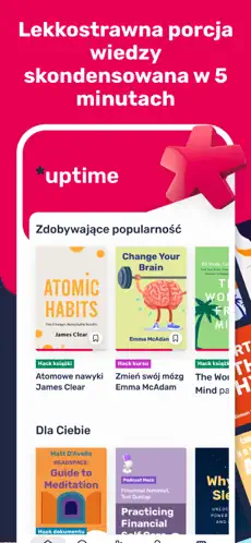 Uptime – Wiedz więcej to aplikacja, która znacząco ułatwia zdobywanie wiedzy w szybki, nowoczesny i efektywny sposób. Dzięki skrótom najważniejszych książek, kursów i podcastów staje się niezastąpionym narzędziem dla każdego, kto chce rozwijać się mimo braku czasu.