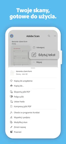 To rozszerzona wersja popularnej aplikacji Adobe Acrobat Reader, wyposażona w funkcję OCR, która pozwala przekształcić zeskanowane dokumenty lub zdjęcia w edytowalny i możliwy do przeszukiwania tekst. Dzięki temu możesz pracować z dokumentami papierowymi tak samo wygodnie, jak z cyfrowymi.