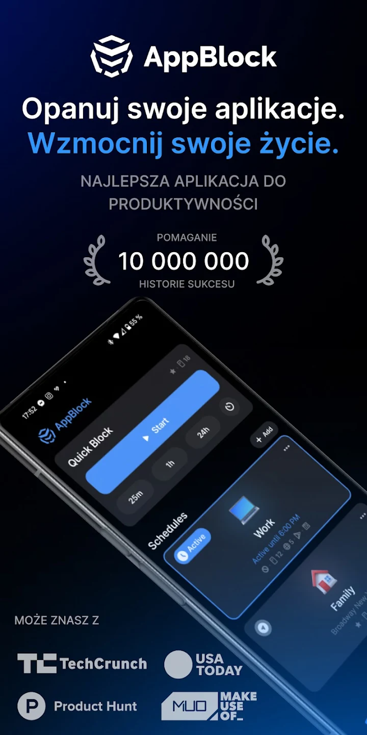 AppBlock – Blokuj Appki, Strony to praktyczna aplikacja mobilna, która pomaga ograniczyć rozpraszanie uwagi spowodowane nadmiernym korzystaniem z telefonu. Dzięki funkcji blokowania aplikacji oraz stron internetowych użytkownik może skutecznie zwiększyć koncentrację, poprawić produktywność i zadbać o zdrową równowagę cyfrową.