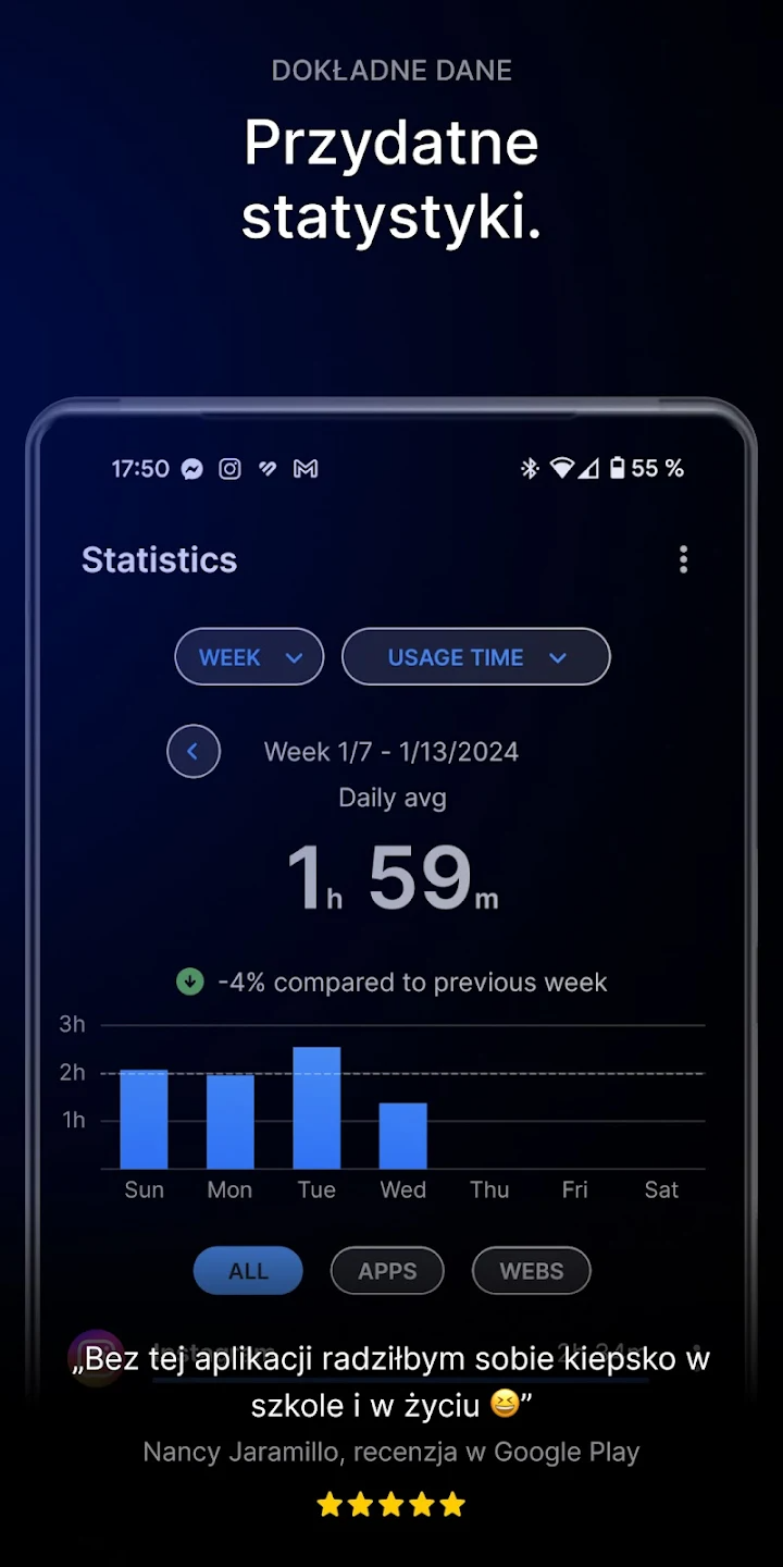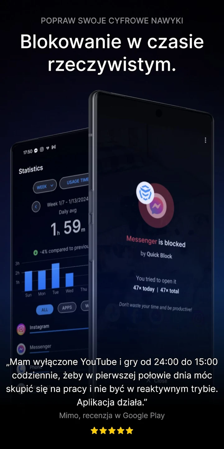 Monitoruj czas spędzony w aplikacjach i analizuj swoje cyfrowe nawyki.