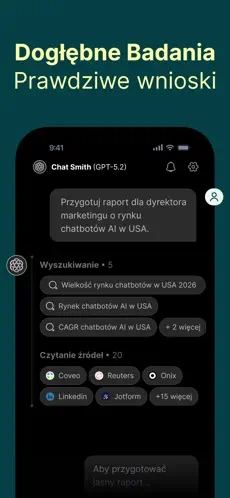Chat Smith – Czat AI i Agent to aplikacja mobilna wykorzystująca technologię AI do prowadzenia rozmów z użytkownikiem oraz wspierania go w różnych zadaniach – od pisania tekstów po analizę informacji.