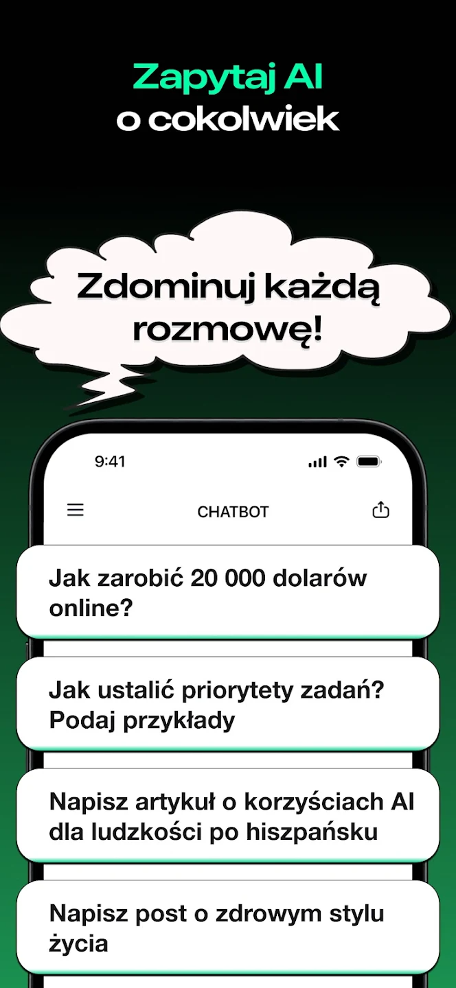 Chatbot – Smart Asystent AI to praktyczne narzędzie dla uczniów, studentów oraz osób pracujących. Aplikacja pomaga zwiększyć produktywność, oszczędzać czas i uporządkować informacje. Dzięki AI użytkownicy mogą: