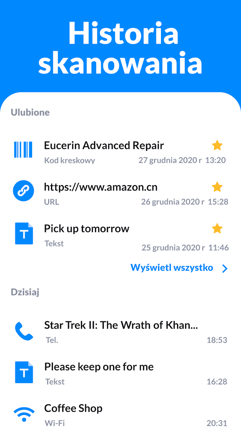 Aplikacja zapisuje historię zeskanowanych kodów, co pozwala na szybki powrót do wcześniej odczytanych informacji.