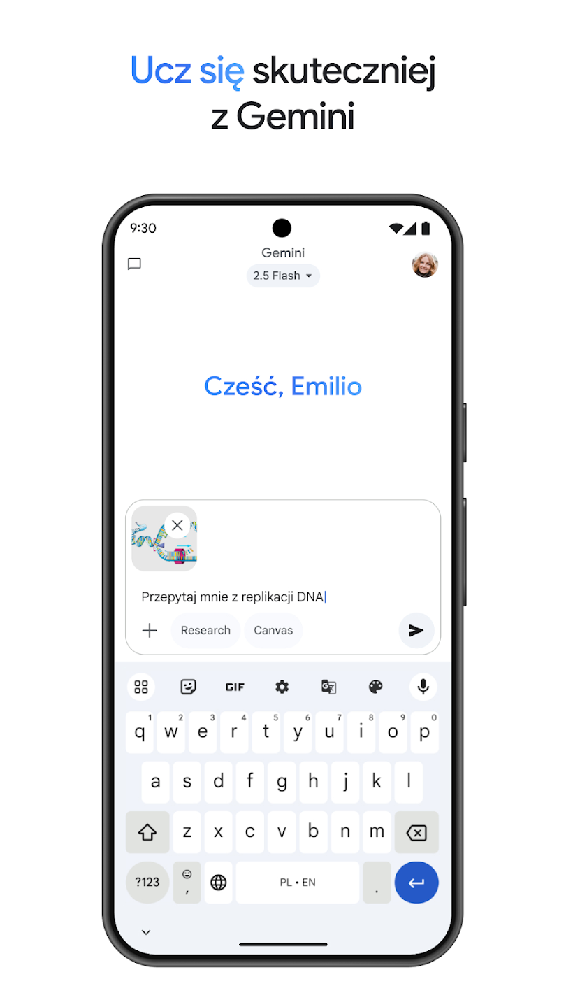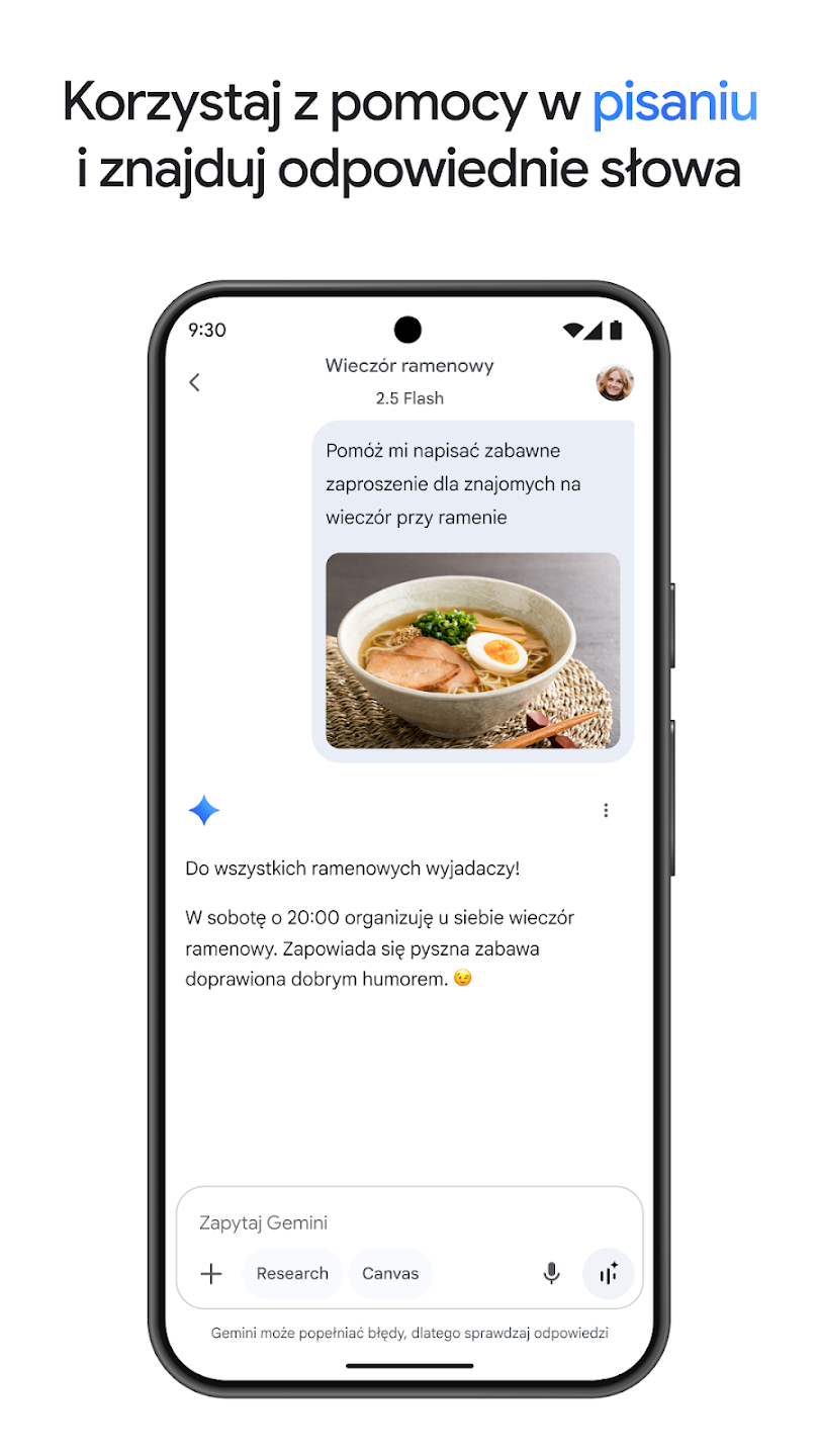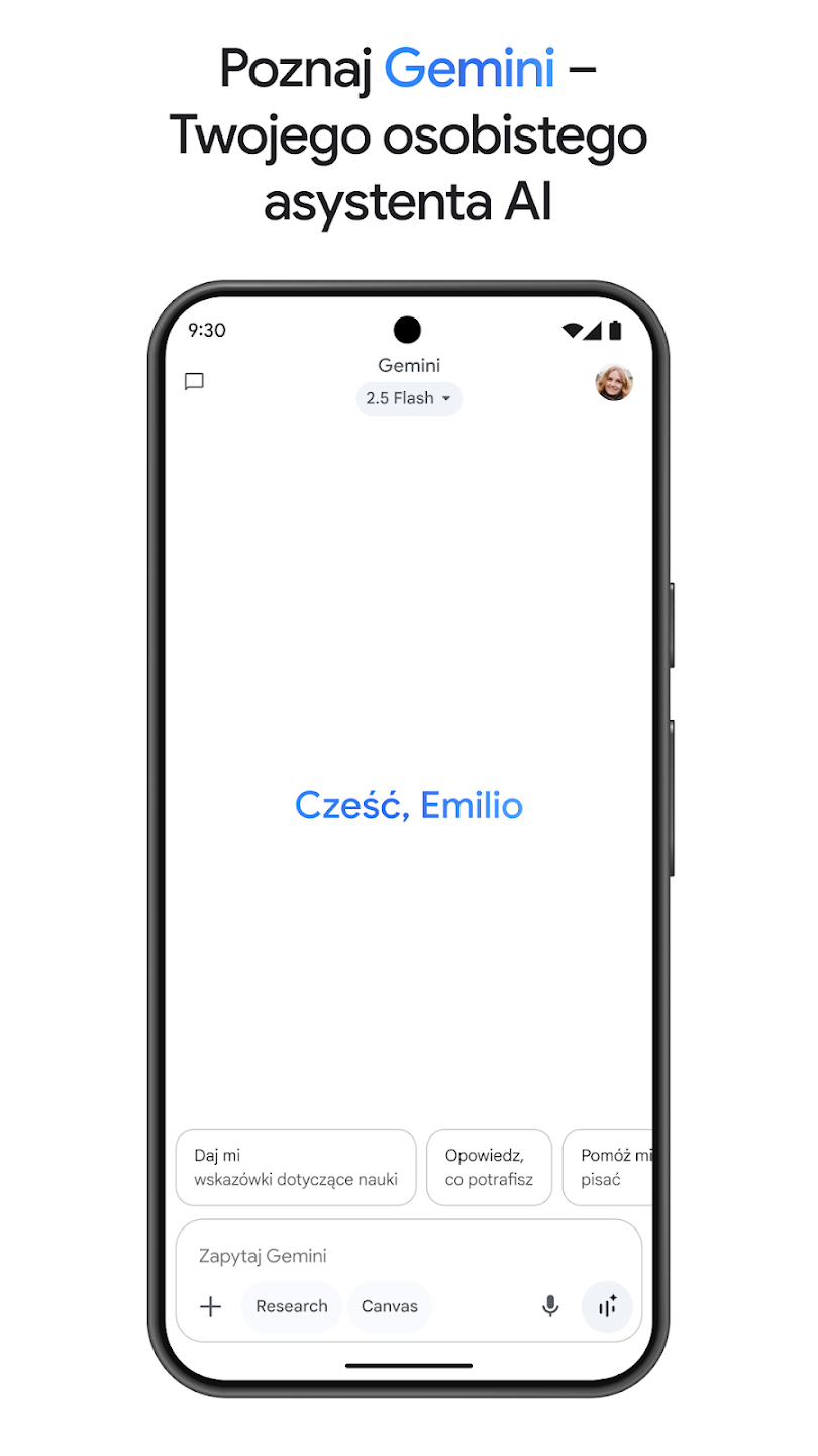 • Asystent nauki i pracy – Gemini wspiera w pisaniu e-maili, raportów, prezentacji czy nauce języków obcych.