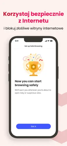 Aplikacja ostrzega przed fałszywymi stronami internetowymi, próbami phishingu oraz podejrzanymi linkami, zwiększając bezpieczeństwo przeglądania sieci.
