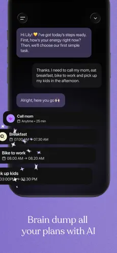 Tiimo wyróżnia się przejrzystym, wizualnym harmonogramem dnia. Zadania prezentowane są w formie kolorowych bloków czasowych, dzięki czemu łatwo zobaczyć, ile czasu zajmuje każda aktywność.
