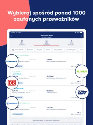 Zarezerwuj bilety na podróż w kilka kliknięć – bez kolejek, bez wydruków. Wszystkie bilety są przechowywane w aplikacji. - Obsługa ponad 35 krajów i wielu języków